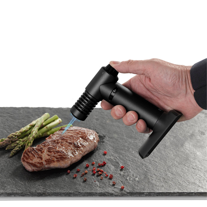 Das perfekte Spiel mit dem Feuer. Genießer und Genießerinnen lieben das Spiel mit dem Feuer in der Küche – denn es gibt zahlreiche Gelegenheiten sorgfältig zubereitete Gerichte durch Flambieren, Karamellisieren, Glasieren oder Schmelzen noch köstlicher zu machen. Die Creme Brulée ist da nur ein Beispiel – auch herzhafte Speisen vertragen etwas Zauberei zum Beispiel mit erhitztem Zucker. Oder wie wäre es, Gemüse und Fleisch mit feinen Röstaromen und einer krossen Kruste zu versehen oder aber zum Glänzen zu bringen. Der Flambierbrenner BRULÉE ist mit einem Druckschalter stets einsatzbereit und mit bequemer Dreh-Arretierung ausgestattet. So kann man beim Flambieren, Karamellisieren & Co. mühelos eine Dauerflamme mit hoher Hitzeentwicklung erzeugen. Mit der einstellbaren Flammenstärke lässt sich zudem die Temperatur stufenlos regulieren, denn eine Creme Brulée braucht deutlich weniger Hitze als eine Kräuter- oder Käsekruste. Dank seiner langfristig zuverlässigen Piezo-Zündung arbeitet der BRULÉE dauerhaft und sicher. Apropos Sicherheit: Eine Sicherungsverriegelung verhindert eine unbeabsichtigte Zündung des nachfüllbaren Brenners und der ausladende Fuß macht den BRULÉE besonders standfest, so ist er kurzerhand auf der Arbeitsplatte zu platzieren. Kreatives Experimentieren mit variantenreichen Zutaten wird mit BRULÉE zum einladenden Vergnügen.